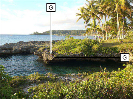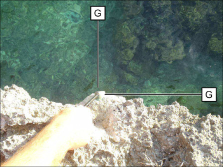 "Repère en laiton scellé dans le corail dans le NW du repère D (ST) à 20 m, utilisé pour les mesures de tirant d'air."