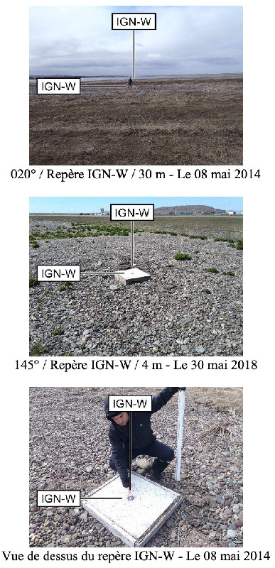 "Clou d'arpentage avec collerette scellé dans une dalle carré en béton de 1m de côté, peinte en blanc. La dalle se situe à proximité (Sud) du milieu de la piste d'atterrissage de l'aérodrome. Repère fondamental."