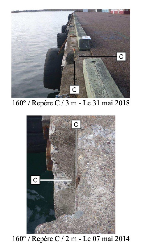 "Ancien repère de tirant d'air et repère fondamental. Boulon rouillé et légèrement tordu, scellé horizontalement dans l'angle de la jetée Est du port de Miquelon près de l'échelle permettant l'accès aux embarcations. Détruits."