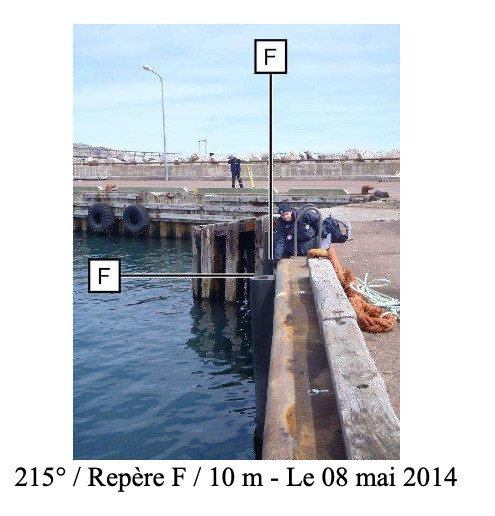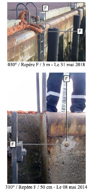 "Douille SHOM scellée horizontalement dans le quai en béton, côté port. Nouveau repère de tirant d'air."