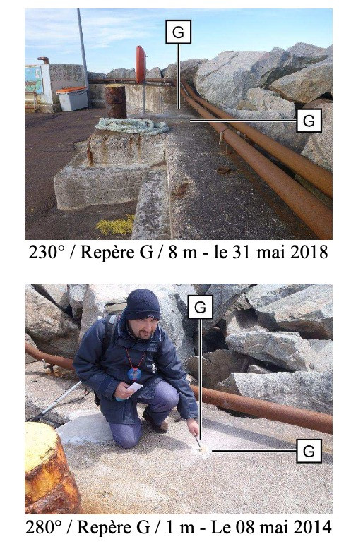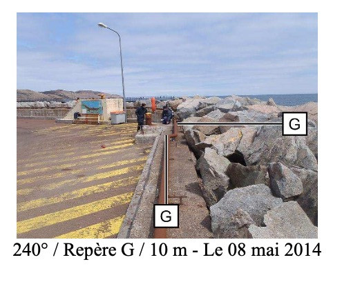 "Douille SHOM scellée verticalement à proximité de la bite d'amarrage située dans le coin Sud-Est du quai Est."