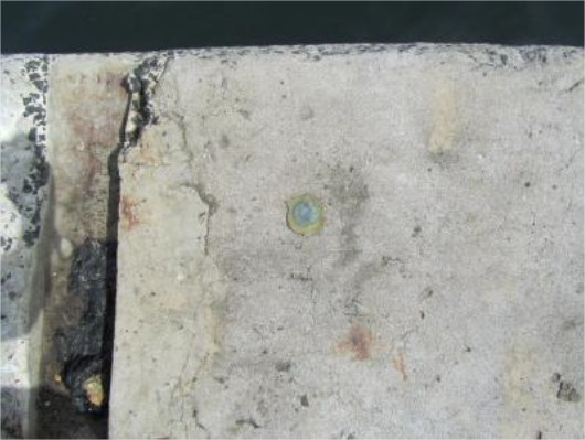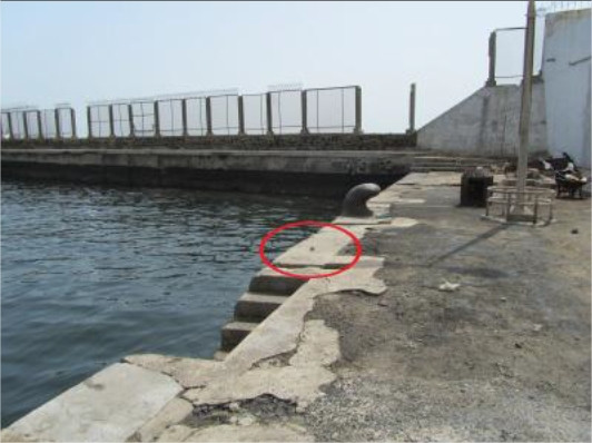 "The bench mark is a 1 1/2" domed brass disk set in the cncrete with gray epoxy. The point is located on the sea wall that runs East to West and makes a corner with the jetty that the tide gage is on. The point is 80 cm from the edge of the top stair that goes down to the water. It is 25 cm form the edge of the sea wall and 336 cm form the first bollard coming from the corner. Source: UHSLC "