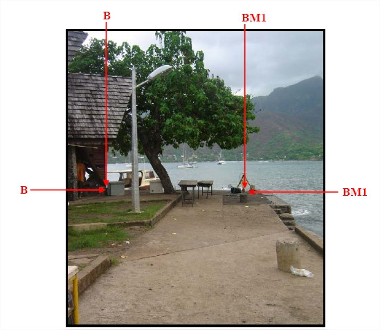 "Repère SHOM scellé horizontalement à la base du bâtiment le plus nord de la gare maritime. Repère pérenne."
