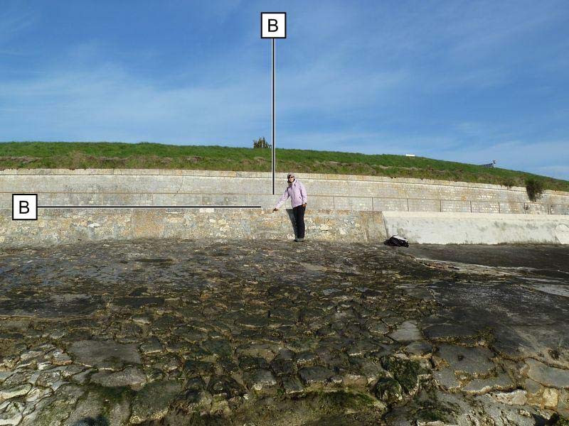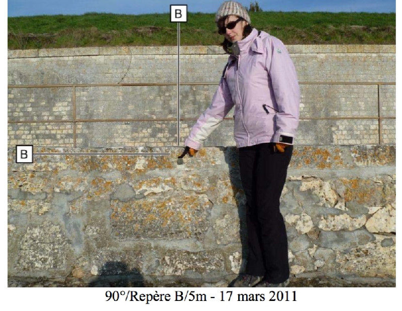 "Repère SH scellé dans la partie verticale de la digue Sainte- Catherine. Repère fondamental."