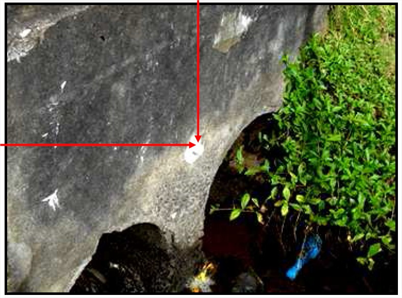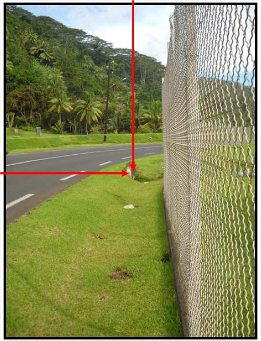 "Repère de nivellement du SAU scellé horizontalement dans un muret le long de la route RT n°3."