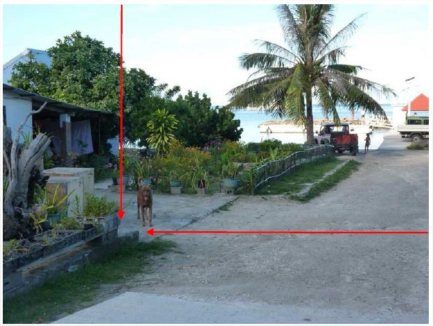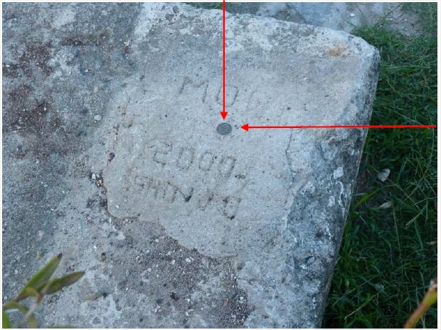 "Douille SHOM scellée dans un angle d’une ancienne fondation de maison et marquée « MOP 2000-SHINJU »."