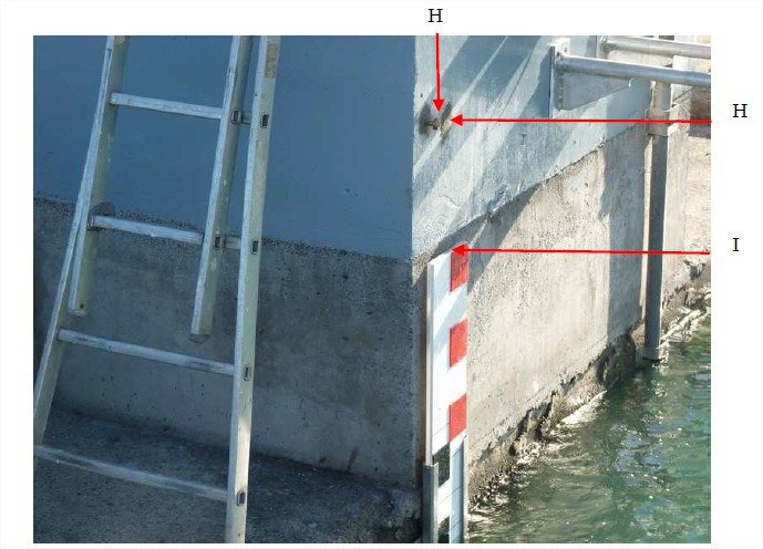 "Repère de type SHOM scellé horizontalement dans le côté Nord de l’abri du marégraphe permanent situé sur le wharf du commerce. Repère de tirant d’air."
