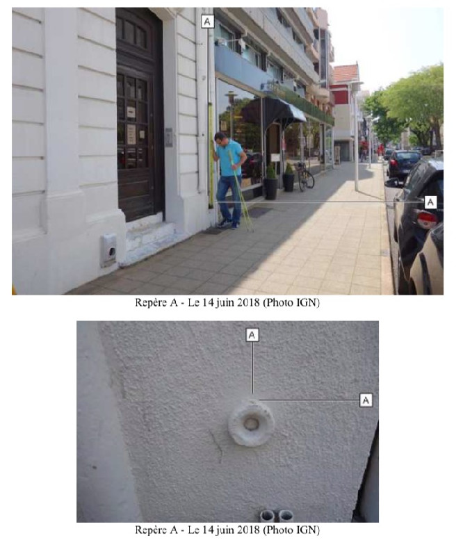 "Repère cylindrique du nivellement général situé sur la façade de l'hôtel ROC à Arcachon. Repère fondamental."